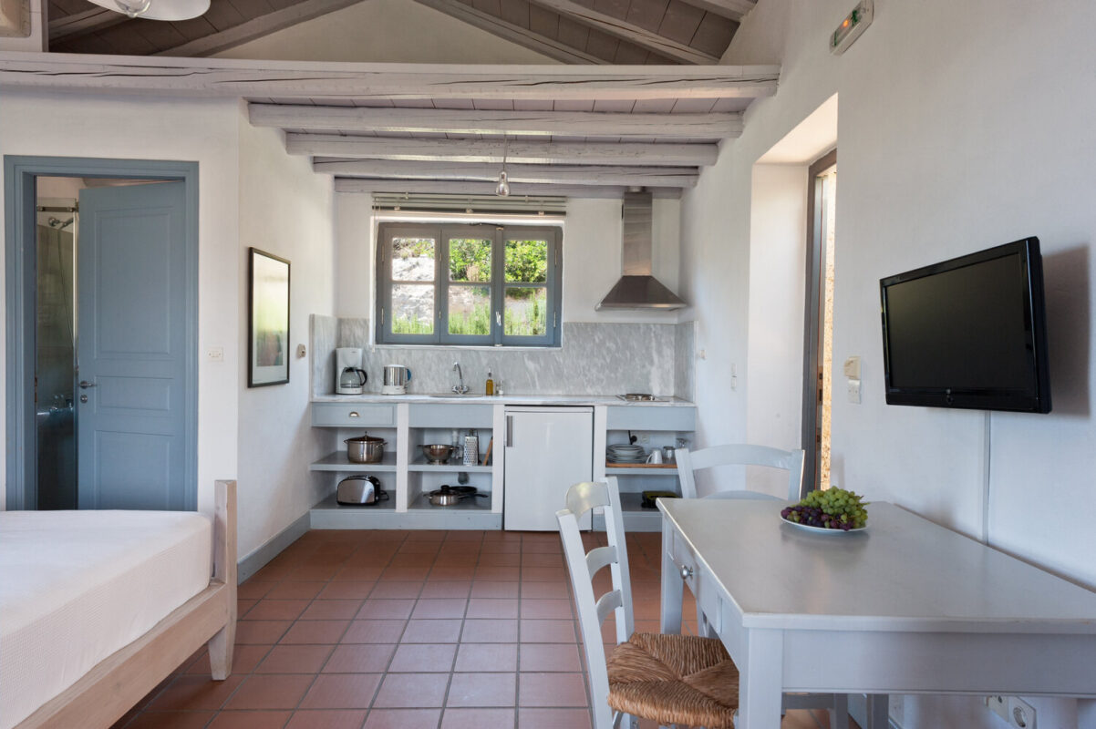 Notos Hotel comprises 14 thoughtfully designed studios and apartments, each reflecting the region’s architectural heritage. Guests can enjoy spacious, sunlit rooms adorned with local art, complemented by fully equipped kitchens and private terraces or verandas that offer stunning views of the Messinian Gulf. The minimalist yet cozy interiors ensure a comfortable stay, allowing guests to feel at home amidst the beauty of Mani.