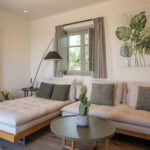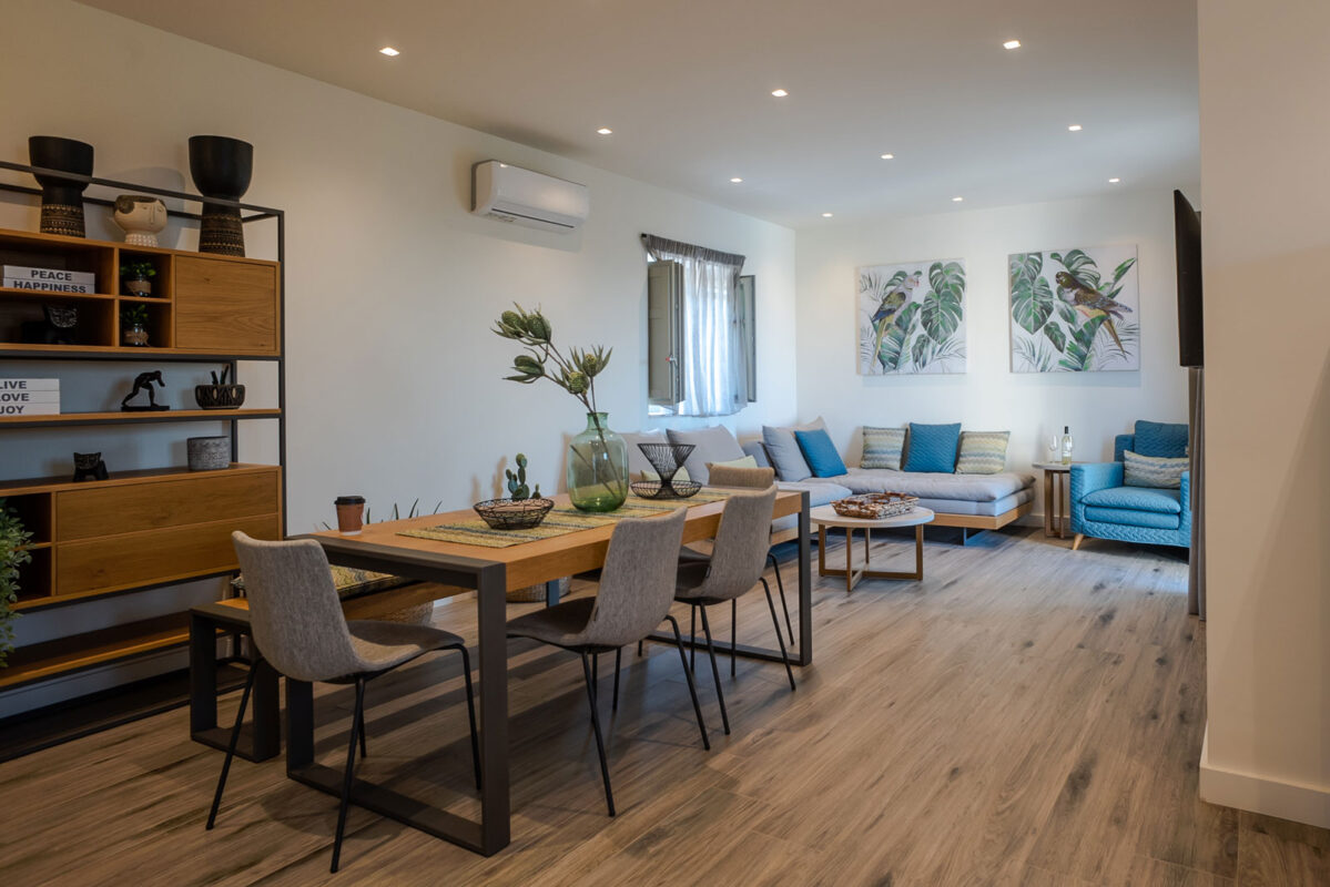 Inside, the villas are equally impressive. Spacious and filled with natural light, each home includes two bedrooms (one with a king bed and one with twin beds), two bathrooms, a full kitchen, and a welcoming living space. Some villas also feature an upper terrace with a jacuzzi and panoramic views across the sea and the mountain. This is a stay designed for full relaxation and everyday ease.