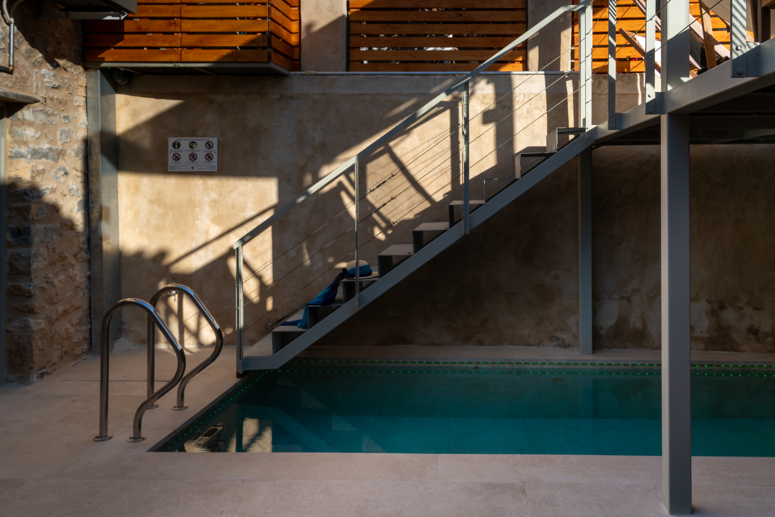 The design of Olive Press 1816 respects the original structure while introducing clean lines, natural materials, and carefully framed views. Stone walls, soft tones, and simple details create a quiet atmosphere that reflects the surrounding landscape.