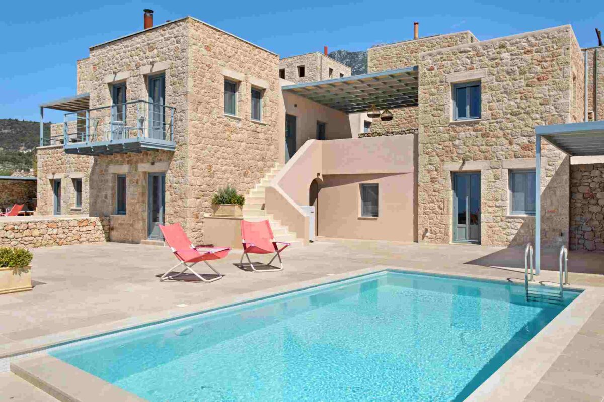 Stone villas with private outdoor areas, terraces, and views across the Messinian Gulf