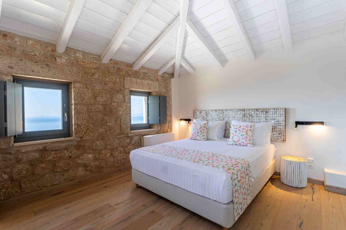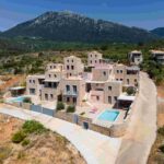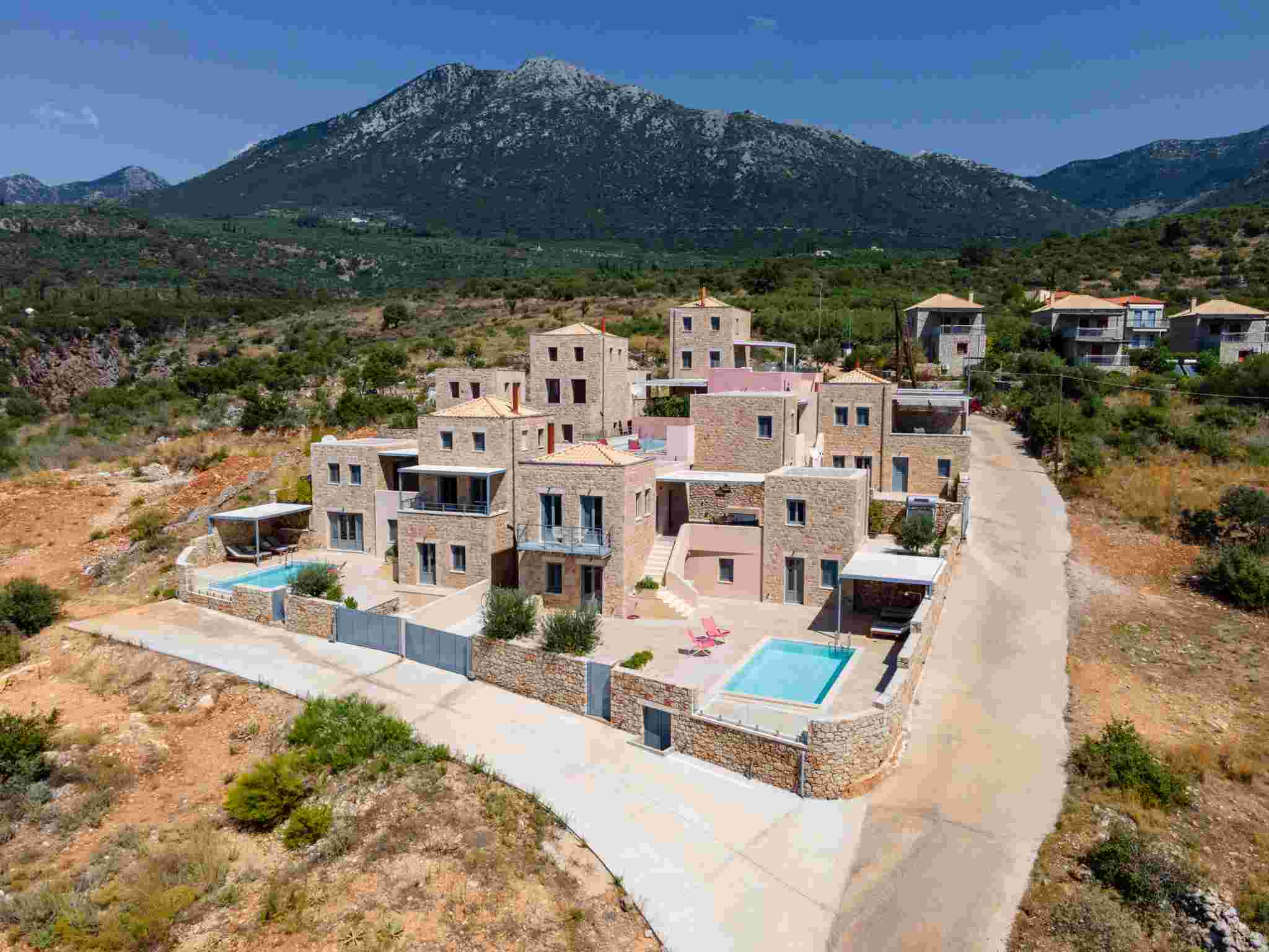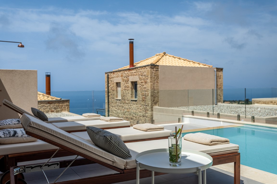 Stone villas with private outdoor areas, terraces, and views across the Messinian Gulf