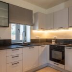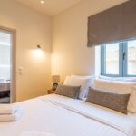 The shared swimming pool is a highlight, with sun loungers and parasols set around a smart courtyard space that guests from both villas can enjoy. Whether you’re starting your day with a dip or returning from the beach for an afternoon swim, this central outdoor area adds a special touch to your stay.